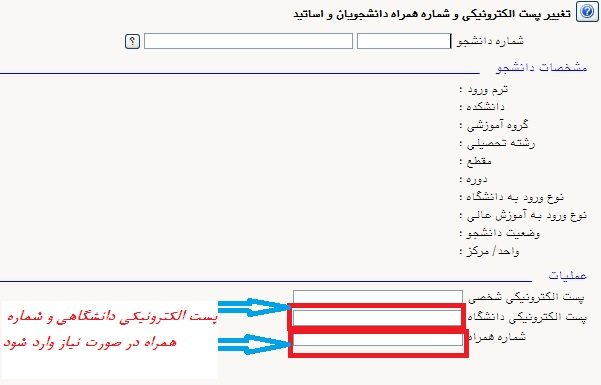 بعد از ورود به سیستم صفحه زیر به شکل خودکار برای دانشجویان نمایش داده می شود که مطابق تصویر باید کامل شود. در صورت باز نشدن صفحه به شکل خودکار، دانشجویان محترم می توانند از منوی آموزش دانشجو مشخصات دانشجو سایر اطلاعات تغییر پست الکترونیکی و شماره همراه دانشجویان و اساتید، پردازش را باز و ایمیل دانشگاهی خود را مطابق با تصویر وارد کنند: