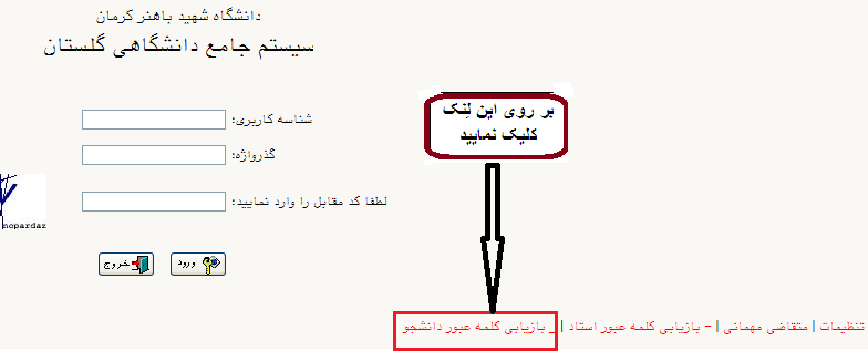 پس از ثبت ایمیل در سیستم در صورت فراموش کردن پسورد، دانشجو می تواند از طریق لینک قرمز رنگ مندرج در صفحه ورود سامانه گلستان (شکل زیر) و کلیک بر روی آن، پسورد خود را بازیابی کند.