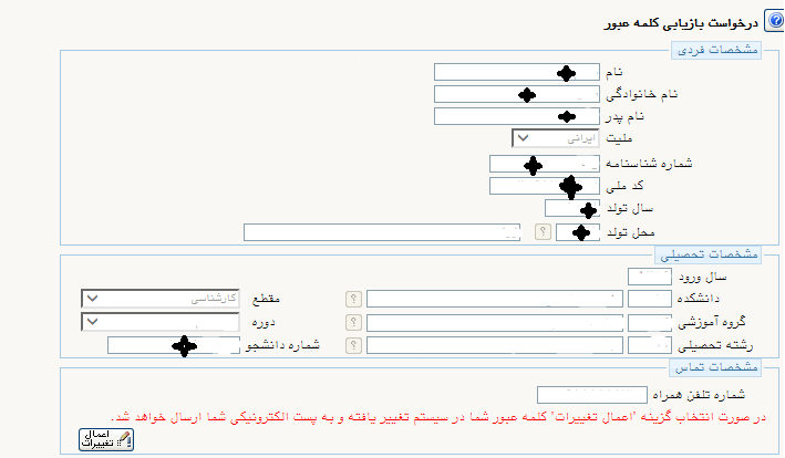 پس از کلیک بر روی این لینک و ورود به سیستم، صفحه زیر نمایش داده می شود و بعد از پر کردن فیلدهایی که اجباری هستند ( در شکل با علامت   مشخص شده اند ) و زدن دکمه “جستجو” در صورت صحیح بودن اطلاعات وارد شده توسط دانشجو، دکمه “اعمال تغییرات” در صفحه نمایش داده می شود که با کلیک بر روی آن کلمه عبور دانشجو در سیستم تغییر و به ایمیل دانشگاهی ایشان ارسال می شود: