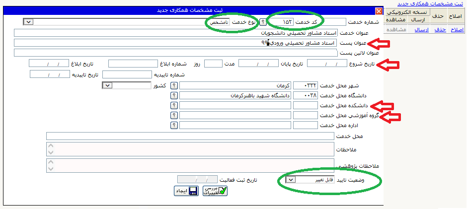 ۱- در اطلاعات جامع پژوهشی استاد از ردیف ۳۰ با عنوان “استاد راهنمای تحصیلی” فعالیت جدیدی با نوع خدمت “نامشخص” و کد خدمت ۱۵۲- استاد مشاور تحصیلی دانشجویان تعریف شود. لازم است فیلدهای تاریخ شروع، عنوان پست و دانشکده (با انتخاب از لیست) و گروه محل خدمت (با انتخاب از لیست) تکمیل گردند و وضعیت تایید برابر”عدم تایید” باشد و فعالیت ثبت شود.