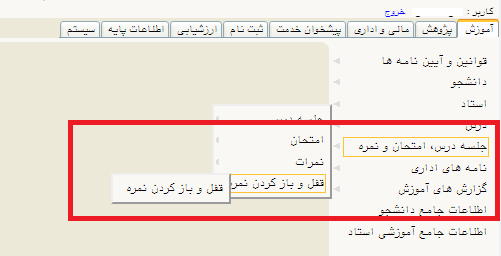 برای تایید لیست نمره ابتدا لازم است روسای بخش نمرات تایید شده استاد را تایید نمایند به این منظور برای دروسی که از لحاظ ثبت نمرات عادی هستند یعنی نمرات درس در زمان یکسان به وسیله استاد ثبت و تایید می گردند، از مسیر تایید نمره مطابق شکل زیر از مسیر “آموزش – جلسه درس، امتحان و نمره – قفل و بازکردن نمره – قفل وباز کردن” وارد پردازش قفل و بازکردن نمره شوند.