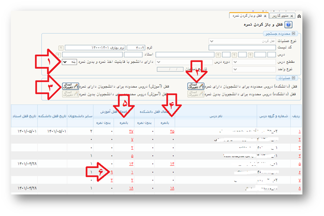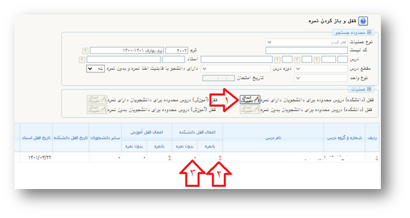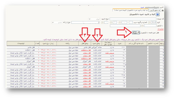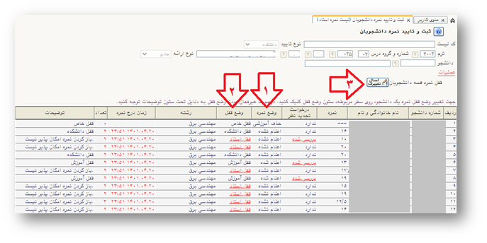 ۱ با کلیک اعمال تغییرات مشخص شده نمرات تمامی دانشجویان دارای نمره در این لیست قفل می شوند. با توجه به کاربرد این پردازش برای قفل تکی نمرات از این گزینه استفاده نشود.