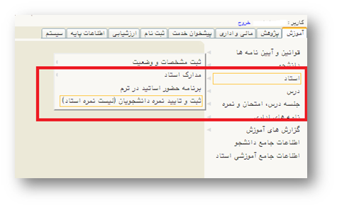برای قفل نمراتی که امکان قفل نمره یک دانشجو از لیست به صورت تکی وجود دارد که شامل دروس پروژه، کارآموزی و کارورزی، پایان نامه و رساله و دروس خودخوان یا دروس آزمایشگاهی که به تشخیص روسای بخش لازم است دارای قفل تکی باشند مطابق تصویر زیر از مسیر “آموزش – استاد – ثبت و تایید نمره دانشجویان لیست نمره استاد” وارد پردازش “ثبت و تایید نمره دانشجویان لیست نمره استاد” شوید.