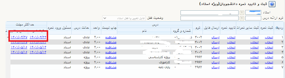 با عنایت به بند دوم صورت جلسه شماره ۸۶۲۵۰ مورخ ۳۰/۱/۱۴۰۱ شورای آموزشی و تحصیلات تکمیلی دانشگاه در خصوص اعمال بازه زمانی مهلت ارسال نمرات و ایجاد گردش کار درخواست تمدید مهلت ارسال نمرات در منوی پیشخوان خدمت سامانه گلستان، از ترم بهاری ۱۴۰۱-۱۴۰۰ به جای قفل لیست های بدون نمره در زمان پایان مهلت ثبت نمرات برای ارسال نمرات در سامانه آموزشی مهلت تعریف شده است و این مهلت مطابق تصویر زیر در پردازش “ثبت و تایید نمره دانشجویان (ویژه ی استاد)” در ردیف هر درس و در ستون “حداکثر مهلت” قابل مشاهده است.
