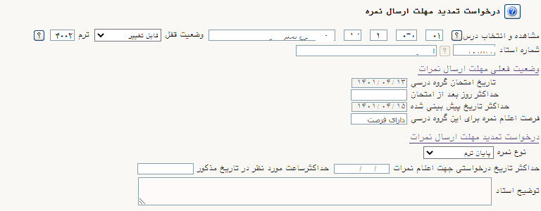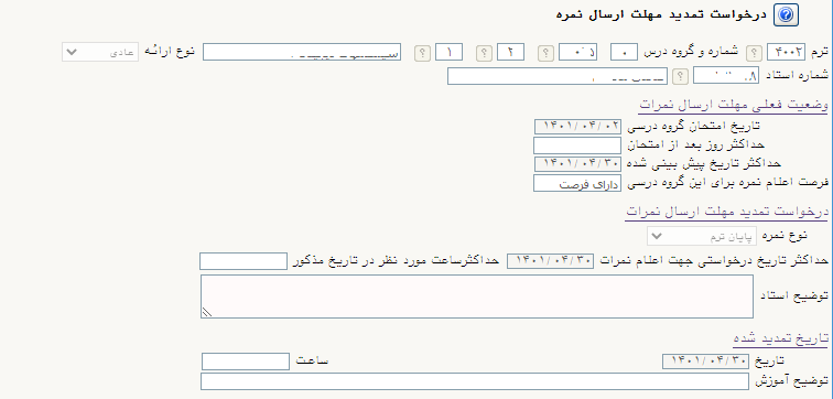 با پایان یافتن مهلت ارسال نمرات برای ثبت نمرات لازم است استاد درخواست تمدید مهلت ارسال نمرات را به شیوه ی زیر ثبت نماید. به این منظور با کلیک بر روی تاریخ درج شده بر در ستون حداکثر مهلت در ردیف مربوط به درس وارد پردازش “درخواست تمدید مهلت ارسال نمرات” می شوید.