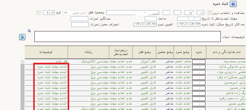 و در هنگام ثبت نمرات در صورت پایان یافتن مهلت ارسال نمرات در لیست نمره مطابق تصویر زیر امکان اعلام نمره وجود ندارد و در قسمت توضیحات “اتمام مهلت ثبت نمره” درج شده است.