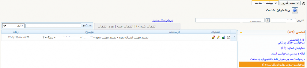 پس از مشاهده این پیام درخواست شما به پیشخوان منتقل می شود و در پیشخوان در “درخواست تمدید مهلت ارسال نمره” مشاهده خواهد شد.